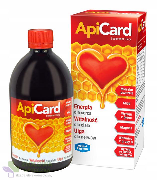 ApiCard zawiera mleczko pszczele i miód, jak również wyciąć z głogu, wyciąg ze skórek z winogron, koncentrat soku z czarnej porzeczki, magnez oraz kompleks witamin z grupy B. Formuła opracowana dla ludzi dbających o swoje serce i pragnących utrzymać organizm w dobrej kondycji.