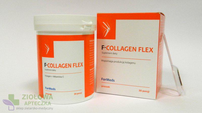 Suplement diety F-COLLAGEN FLEX zawiera naturalnego pochodzenia kolagen II oraz lewoskrętną witaminę C w formie proszku.