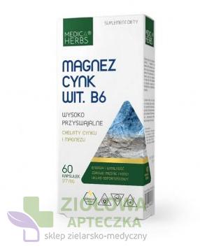 Składniki: (w przeliczeniu na zalecaną porcję do spożycia w ciągu dnia – 1 kapsułka): diglicynian magnezu (chelat magnezu) 800 mg (160 mg magnezu, 43% *RWS); diglicynian cynku (chelat cynku) 55 mg (15 mg cynku, 150% *RWS); chlorowodorek pirydoksyny (witamina B6) 2,1 mg, 150% *RWS; żelatyna (kapsułka).